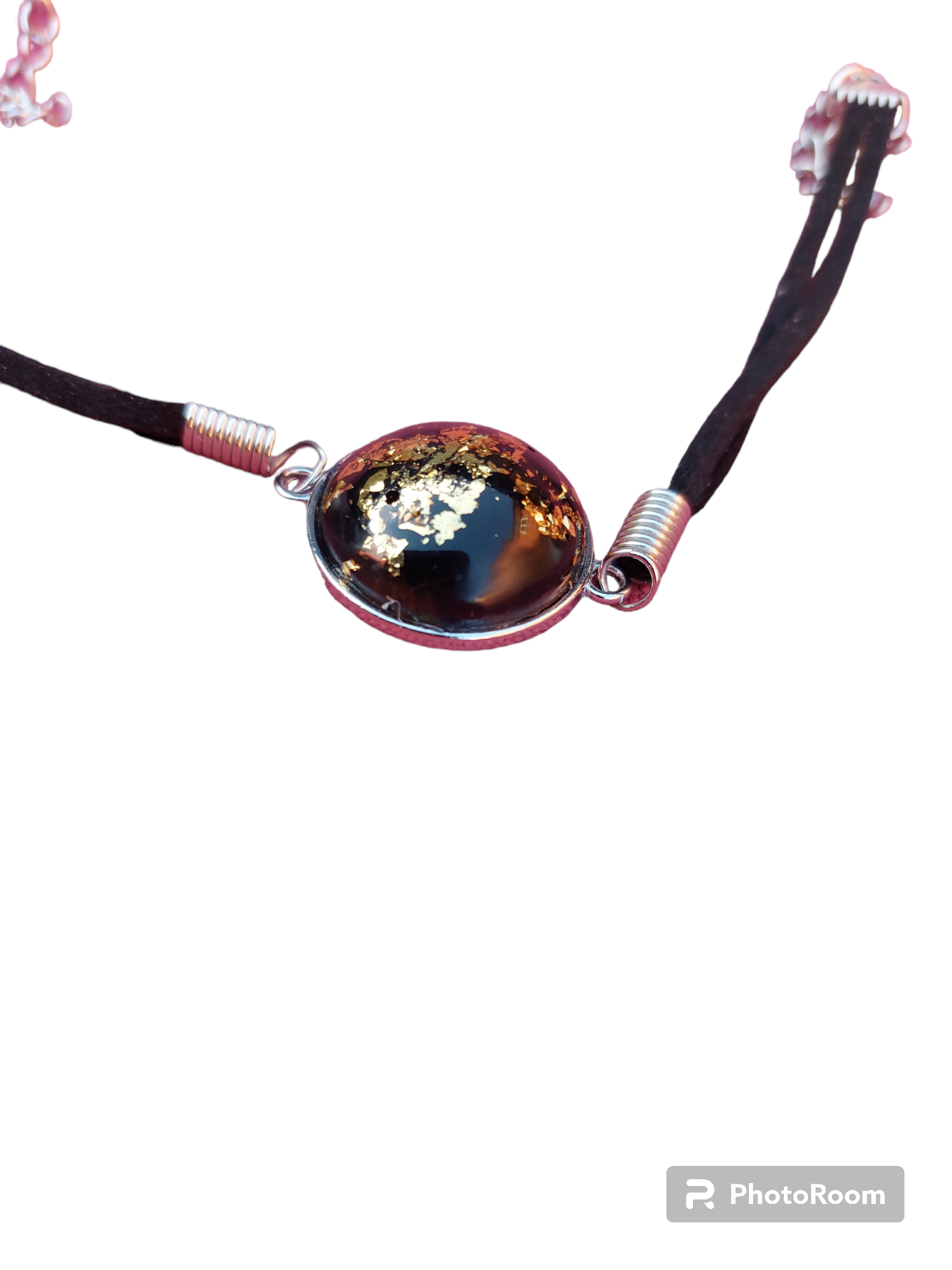 Bracelet with centre made from black glossy resin with gold leaf. The bracelet is made of faux suede with an extender chain. These bracelets compliment some of the necklaces in similar style and colour. Each piece is unique!